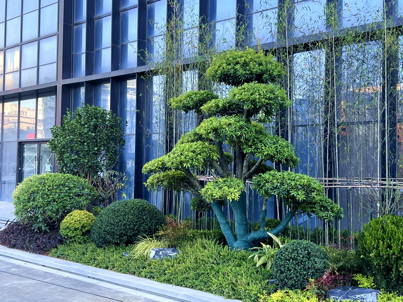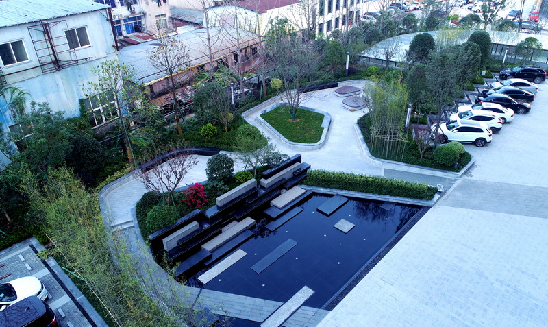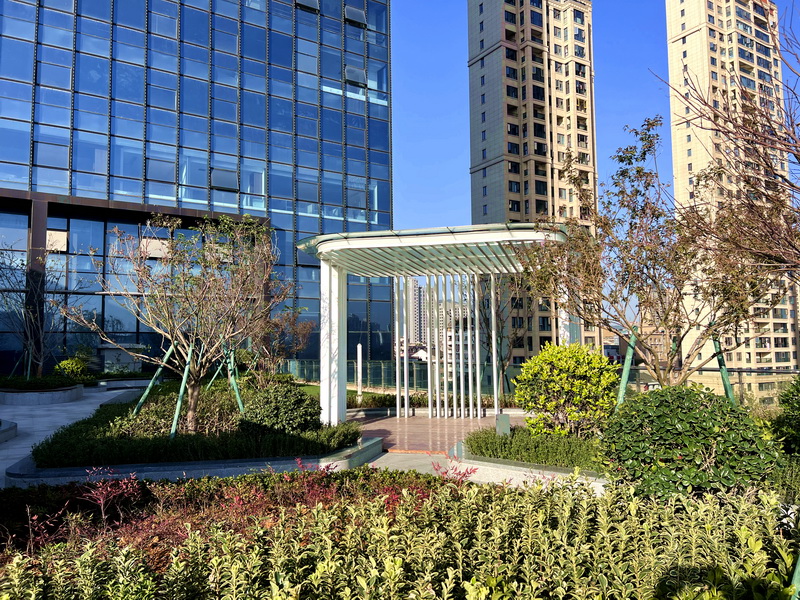 工程所处大楼为银行办公场所,建筑外立面主色调为冷色调,整体环境气氛偏严肃,故在屋顶花园和地面绿化设计中,力图营造一个绿量较大,景观精致,气氛轻松的休憩空间,使人们在繁忙工作之余有一个轻松明快的交流场所。